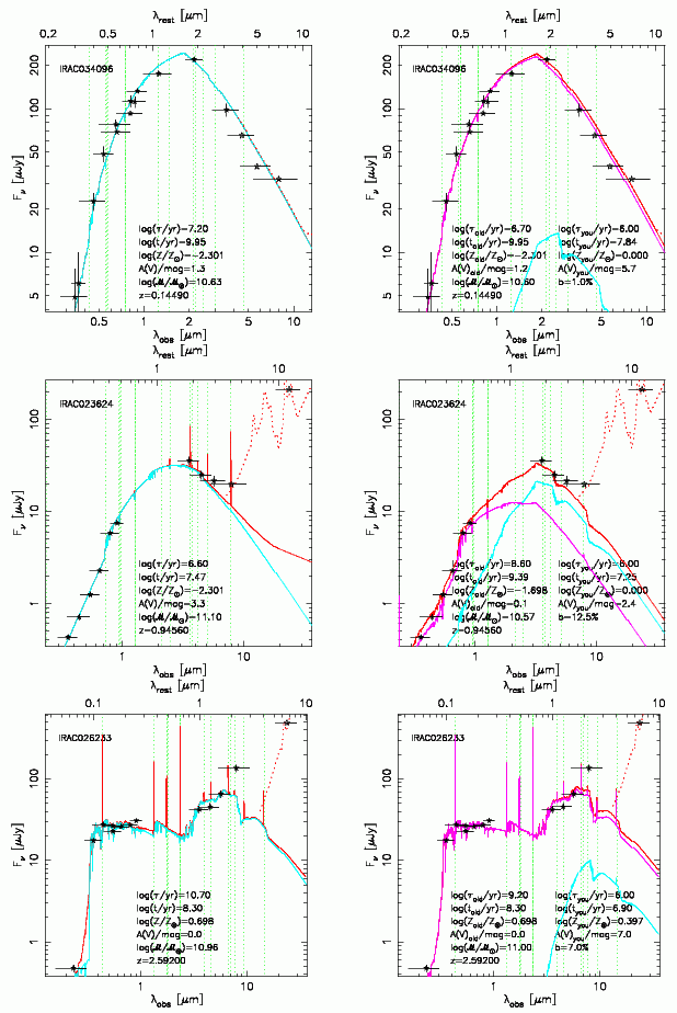 Two of the more interesting plots in that paper are shown above. The first one shows 3 examples of the fits to stellar population and dust emission models used to estimate photometric redshifts, stellar masses, and SFRS for each galaxy in our surveys. On the left column, we show the fits corresponding to a single stellar population characterized by an exponential star formation history. On the right column, we show the same SEDs fitted with 2 populations: an old underlying population and a recent burst.